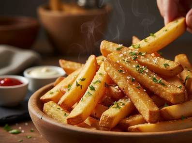 Goreng Tahap Kedua (Meng- Crispy**-kan)**: Minyak dipanaskan lagi sampai suhu tinggi (sekitar $180$-$190^\circ \text{C}$). Kentang yang sudah “beristirahat” tadi dicemplungkan lagi. Kali ini, goreng sampai warnanya keemasan dan teksturnya benar-benar renyah. Proses ini yang menciptakan lapisan luar super crunchy!